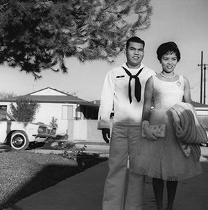 Vicente and Jeanne Agor stand outside their home in the early 1960s. Vicente, who was born in the Philippines, spent 30 years in the Coast Guard before retiring as a chief warrant officer. The Agors have been married for 63 years and currently reside in Southern California.